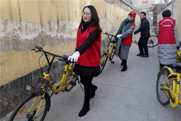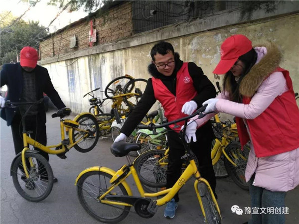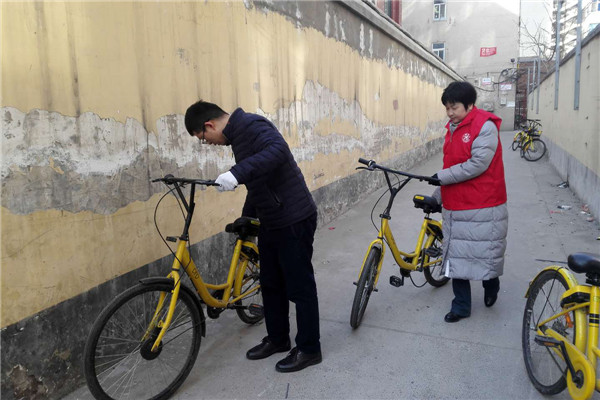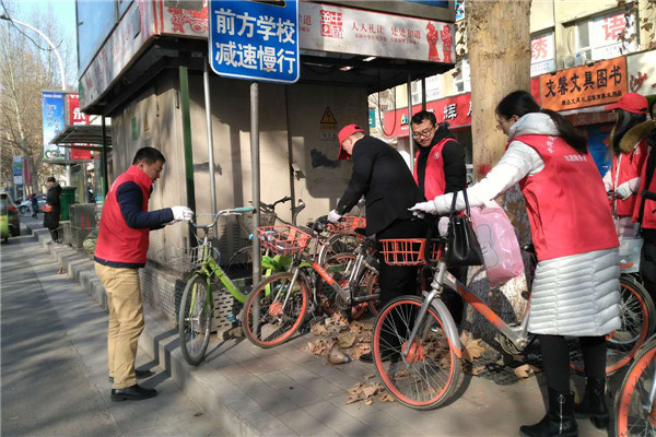 志愿者們冒著寒風(fēng)和低溫,清理家屬院里違規(guī)停放小黃車,并引導(dǎo)社區(qū)居民講文明、樹新風(fēng),養(yǎng)成良好的行為習(xí)慣。經(jīng)過一個(gè)多小時(shí)的勞動,雖然手都凍紅了,但看到近百輛擺放的整整齊齊的單車和井然有序的院子,大家都有滿滿的成就感,也體會到了奉獻(xiàn)的快樂。