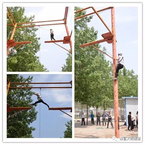 從一開始的團隊破冰,到考驗智慧和勇氣的互動游戲,大家相互配合、彼此信任,英姿颯爽、奮力拼搏。在“高空斷橋”項目中,隊員們爬上8米高空,躍過斷橋后折回,再從空中降落。當(dāng)有隊員面對高空遲疑害怕時,其他隊員都紛紛加油鼓勁,耐心等待,傳遞著集體溫暖的力量,最終所有隊員都順利完成了挑戰(zhàn)。